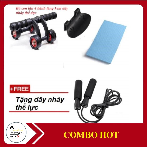 Con lăn tập cơ bụng 4 bánh tặng: Dây nhảy + Thảm + Tấm chặn