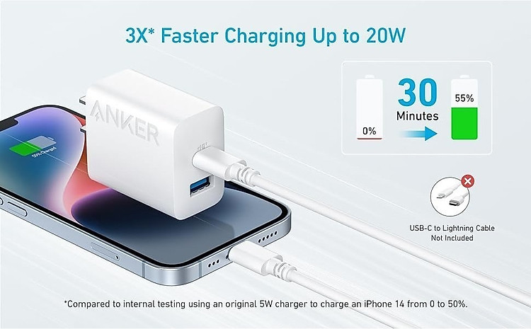 Củ sạc được trang bị công suất 20W, đủ mạnh mẽ để sạc nhanh cho iPhone (từ iPhone 8 trở lên) và các thiết bị Android hỗ trợ sạc nhanh. Bạn sẽ không còn phải chờ đợi lâu để nạp đầy pin cho điện thoại của mình.
