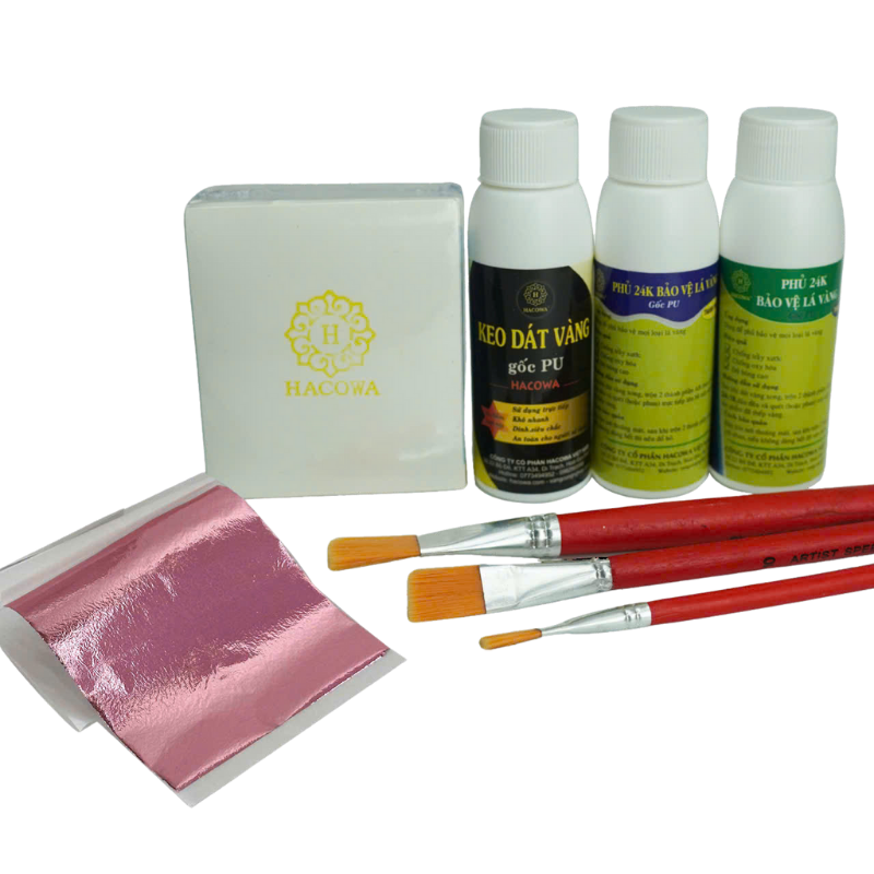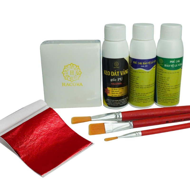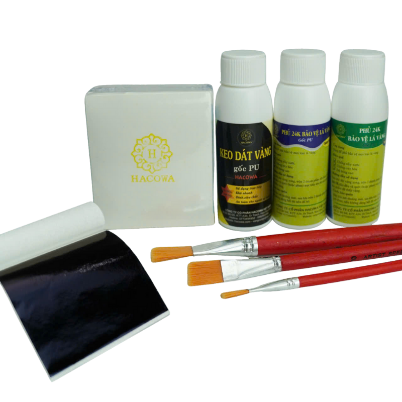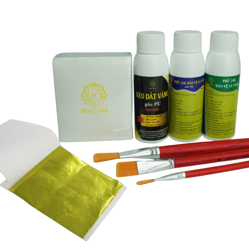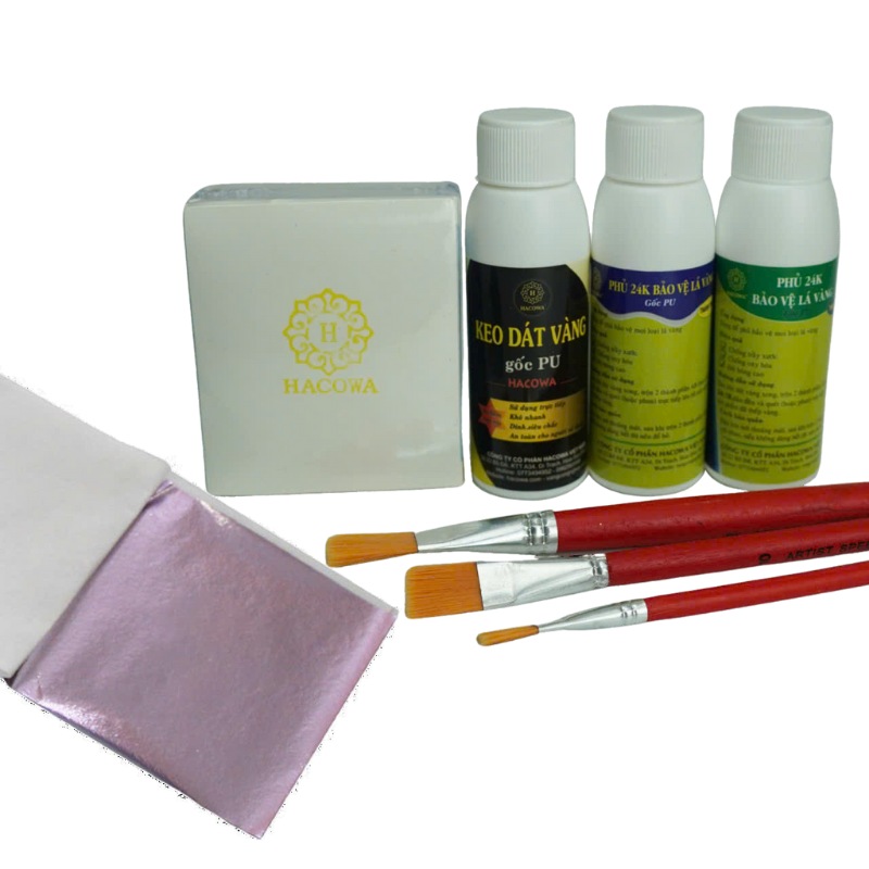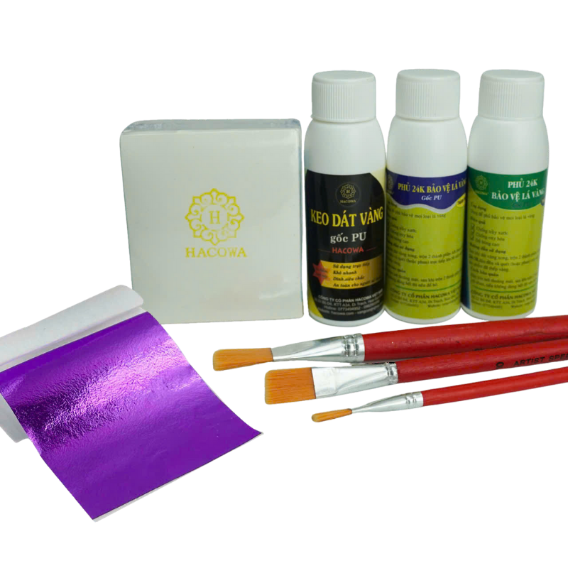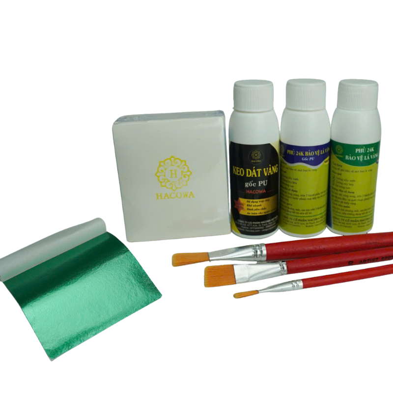 Combo dát vàng gốc Pu gồm 500 lá vàng đa sắc siêu hot (có 8 màu cho bạn lựa chọn: xanh lá, xanh ngọc, xanh biển, đỏ, hồng đào, tím, tím đào, vàng chanh, đen) kèm keo dán lá vàng, phủ bảo vệ vàng sau khi dát xong, cọ chổi quét keo phủ, vệ sinh - dặm vàng như hình.