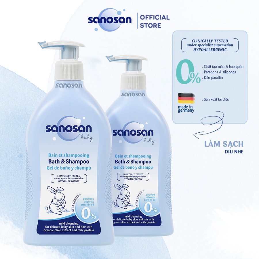 Mẹ & Bé > Đồ dùng phòng tắm & Chăm sóc cơ thể bé > Sản phẩm tắm & gội cho bé || [Mã BMLT300 giảm 10% đơn 499K] Combo Sữa tắm gội Sanosan chiết xuất Olive hữu cơ dung tích (2 chai x 500ml)