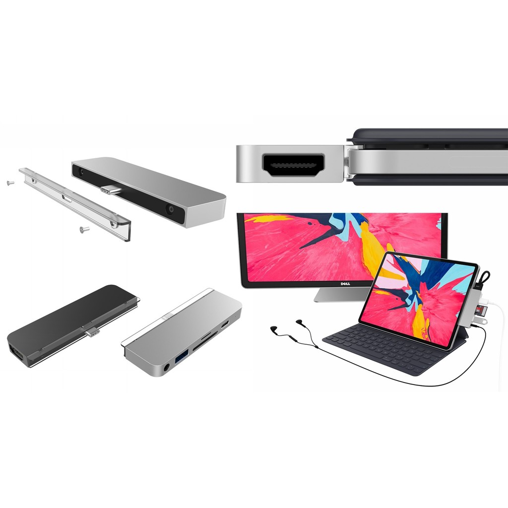 – Chiếc Hub đầu tiên của thế giới được sản xuất cho iPad Pro 2018 – Kết nối trực tiếp từ USBC của iPad Pro 2018 để xuất ra 6 cổng (4K/60Hz, HDMI, 3.5mm audio jack, SD, micro SD, USB-A 3.0 and USB-C Power Delivery) – Một điều tâm đắc nữa là bộ hub này Hyper còn ưu ái cho người dùng tặng kèm luôn một bộ đồ nghề chỉnh chu để tháo lắp thay thế bằng một chiếc Hub dây tiện dụng cho người dùng. – Tay cầm hình chữ C giúp ôm sát Ipad như một thể thống có thể tháo rời và thay thế được làm bằng chất liệu polycarbonate mềm và nhựa ABS giữ chắc chắn và vẫn đảm bảo không bị ma sát trầy xước phần cứng tiếp giáp cổng USB-C của iPad Pro với tay cầm phần cứng của chiếc Hub – Tương thích với iPad Pro 11inch và 12.9inch 2018 có hoặc không có bàn phím Folio – Chiếc hub còn có thể sử dụng vừa vặn và rất chắc chắn với body máy Macbook nên chúng ta có thể sử dụng chiếc Hub này cho iPad và cả Macbook – Hai màu sắc: Silver và Space Gray tương thích với màu máy iPad Pro 2018 – Chiếc Hub được sản xuất bằng nguyên khối Alumium CNC cao cấp không ghỉ – Sản phẩm được bảo hành chính Hãng 1 năm (1 đổi 1) Sản phẩm của tập đoàn Sanho (USA)