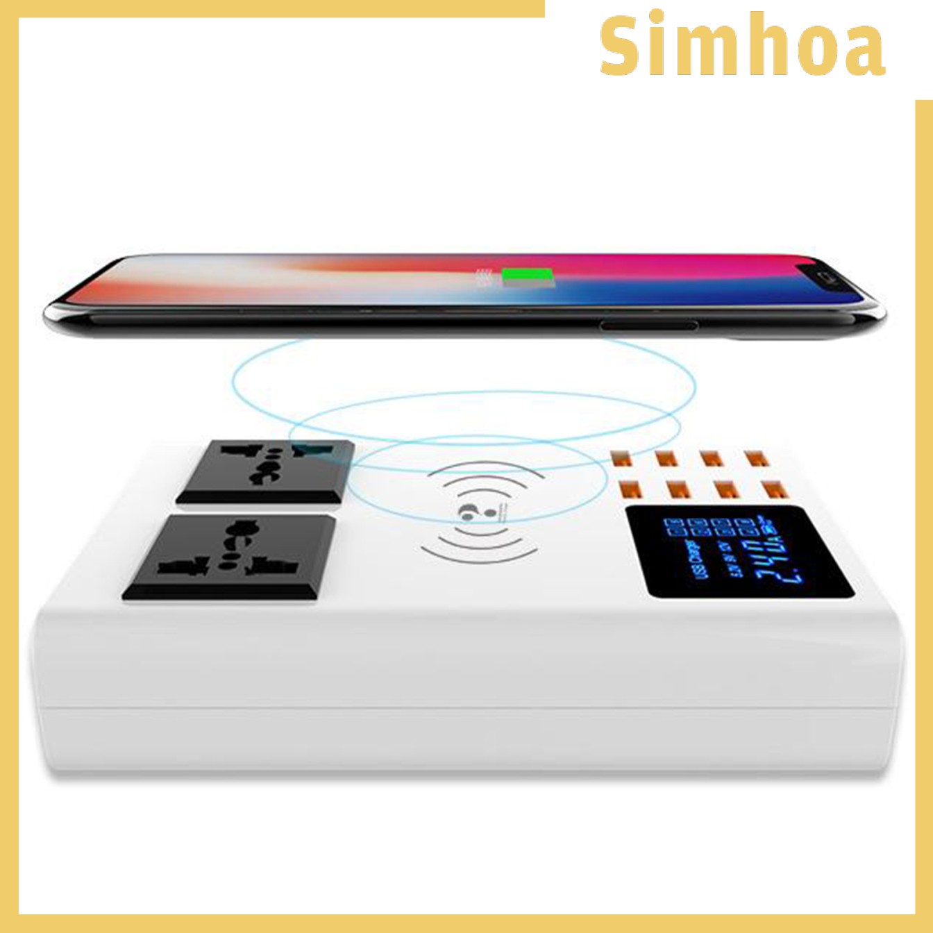 Description: Ultra Powerful: 8 USB ports pump out 40 watts of power and allow charging up to 8 devices simultaneously at full speed. High-Speed Charging: Smart USB ports detect your devices automatically and deliver the fastest possible charge for any device. 8 regular USB ports deliver charging speed up to 2.4 amps, improve charging efficiency by 30%. Visual LCD Display: Euqipped with a LCD digital display, intelligently shows the current and charging status for each charging port on the screen Wide input voltage range of AC100-240V which suits for international travel perfectly. Made of fire-resistance PC shell and 100% copper wire, with professional management system, certified safety by CE ROHS ,Overheat, overcharge, overcurrent, overload, surge, short circuit protection, protects your devices automatically and greatly extending the battery lifetime of your devices. Specification: Input voltage: AC100-240V 50 - 60HZ USB Output: DC 5V / 2400mA 2 AC sockets output power :2500W 10A Max. Package Includes: 1 x 8 ports USB charger hub 1 x power adapter ( us )