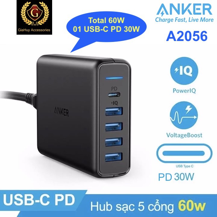 ☼ THÔNG SỐ KỸ THUẬT: - Model: A2056 - Công suất mạnh mẽ: 60W - Đầu vào: AC 100 - 240 V ~ 1.7 A 50 - 60 Hz - Đầu ra: 05 cổng: + 01 cổng USB-C PD 30W: 5V/3A , 9V/3A , 12V/2.5A + 04 cổng USB-A Power IQ: 5/2.4A mỗi cổng Sạc đầy đủ 60W cho dù bạn sạc 05 thiết bị cùng lúc: + 01 cổng USB-C: áp dụng công nghệ sạc nhanh Power Delivery (PD) cho Đầu ra 3A, công suất 30W (Khi sử dụng cốc này, với cáp USB-C ra Lightining ANKER/Apple => Sẽ sạc nhanh bằng công nghệ Power Delivery cho iPhone 8/8 Plus/ X / XR / XS / XS MAX và iPad) + 04 cổng USB: áp dụng công nghệ sạc nhanh độc quyền PowerIQ và công nghệ ổn định dòng VoltageBoost của ANKER, giúp tối ưu hoá tốc độ sạc, cho Đầu ra lên đến 2.4A mỗi cổng mà vẫn đảm bảo đủ công suất 30W.