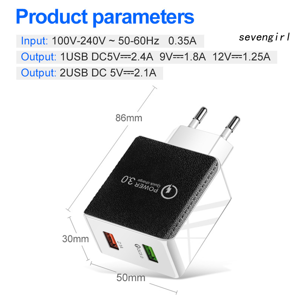 Item Name: Phone Charger Material: ABS Plug Type: EU Plug Input: 100V-240V, 50-60Hz, 0.35A Output: DC5V 2.4A, 9V 1.8A, 12V 1.25A USB Interface: 2 USB Ports Features: Portable, Fast Charging, 2 USB Ports Charger Size: 86mm x 50mm x 30mm/3.38" x 1.97" x 1.18" (Approx.)