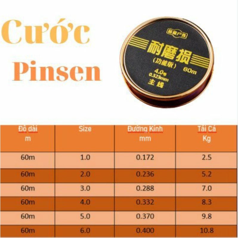 Cuộn Cước Trục Cước Thẻo Chuyên Dụng Câu Đài Pinsen Cao Cấp. Độ dài: 60m Kích thước: 6 size +1.0: Đường kính dây 0.172mm – Tải trọng test máy 2.5kg +2.0: Đường kính dây 0.236mm – Tải trọng test máy 5.2kg +3.0: Đường kính dây 0.288mm – Tải trọng test máy 7.0kg +4.0: Đường kính dây 0.332mm – Tải trọng test máy 8.3kg +5.0: Đường kính dây 0.370mm – Tải trọng test máy 9.8kg +6.0: Đường kính dây 0.400mm – Tải trọng test máy 10.8kg *Ưu điểm nổi bật: - Sử dụng công nghệ nung chảy để bó các sợi nylon - Lực kéo mạnh - Chống mài mòn - Độ nhạy ổn định - Chống xước cao - Cước không giãn, siêu bền - Màu cước 3D đánh lừa thị giác của cá * Đặc biệt: Tải trọng test tương đối chuẩn so với thông số