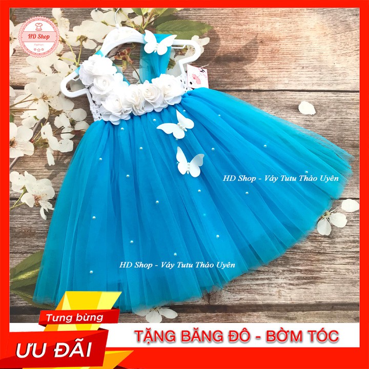Đầm cho bé xanh biển hoa hồng trắng 6 bông đính đá là một sự lựa chọn hoàn hảo để cho bé yêu diện thôi nôi, đầy tháng, sinh nhật, biểu diễn, chup ảnh, dự tiệc, làm quà sinh nhật….