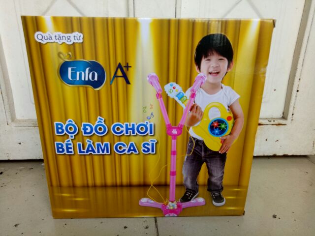 _là quà tặng của sữa enfa. - Chất liệu: Nhựa cứng Đàn bao gồm: - 1 đàn ghita 30cm - 2 mic: mic dài 18cm, đường kính 4cm - 1 chân đế có thể tăng giảm chiều cao. - Sản phẩm sử dụng pin AA để hoạt động - Kích thước hộp đàn 19x5x48cm - Màu sắc: Xanh/ Hông _đàn ghita Micro là dụng cụ hữu ích cho bé trong những ngày đầu tập làm quen với đàn và âm nhạc. Kiểu dáng như một chiếc đàn thật cùng các chế độ có sẵn trong máy giúp bé yêu thích thú hơn trong việc luyện tập.