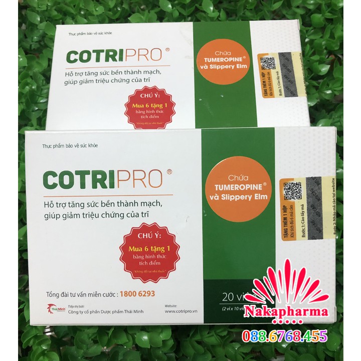 ✅ CHƯƠNG TRÌNH TÍCH ĐIỂM: • Trên mỗi hộp Cotripro đều có mã cào. Mỗi thẻ cào tích điểm thành công bạn được 1 điểm. • Tích đủ 6 điểm bạn được tặng ngay 01 hộp Cotripro cùng loại • Cách tích điểm: + Cách 1: Soạn TMPMã cào gởi 8079 + Cách 2: Nhập mã cào trực tiếp tại Quatang.tmp.vn + Cách 3: Scan QR codde trên tem • CAM KẾT HOÀN TIỀN NẾU DÙNG SAU 2 THÁNG KHÔNG HIỆU QUẢ. VUI LÒNG ĐĂNG KÝ TẠI 1800.6293 (FREE)