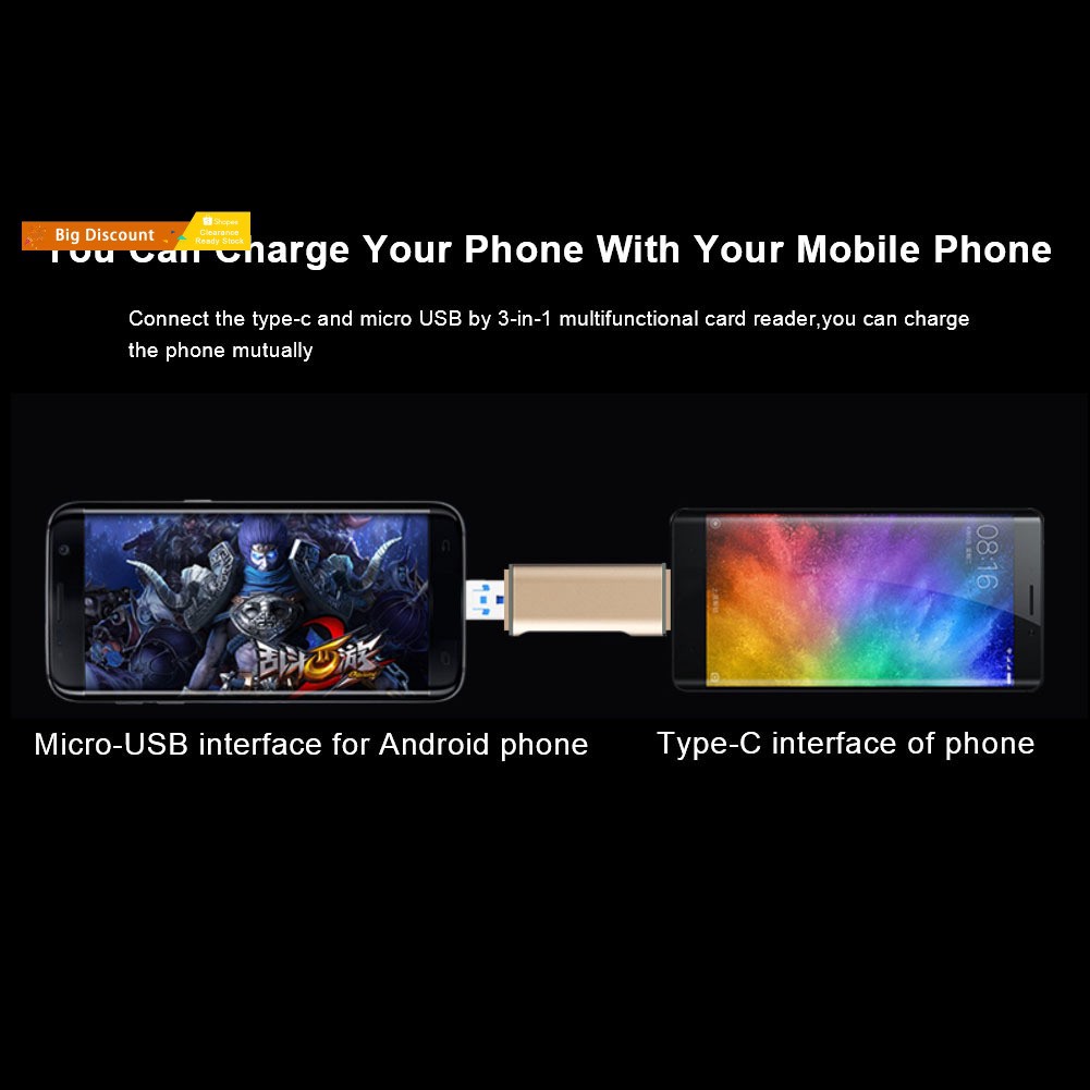 Specifications: Multifunctional 3 in 1 USB-A/Micro USB/Type-C Port TF/SD Card Reader with OTG. Using your phone conveniently to read any file, contract, working date, picture, music or film anywhere. Support TF / SD card read on smart phone through OTG. Portable and light design housing with aluminum alloy. Easy and convenient for carrying in your laptop bag. No drivers required, plug and play.