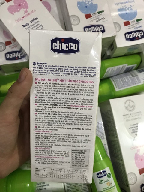 Chiết xuất tinh dầu cám gạo, dầu mát-xa Chicco giúp loại bỏ các bụi bẩn, bã nhờn, nhẹ nhàng làm sạch da Bé.