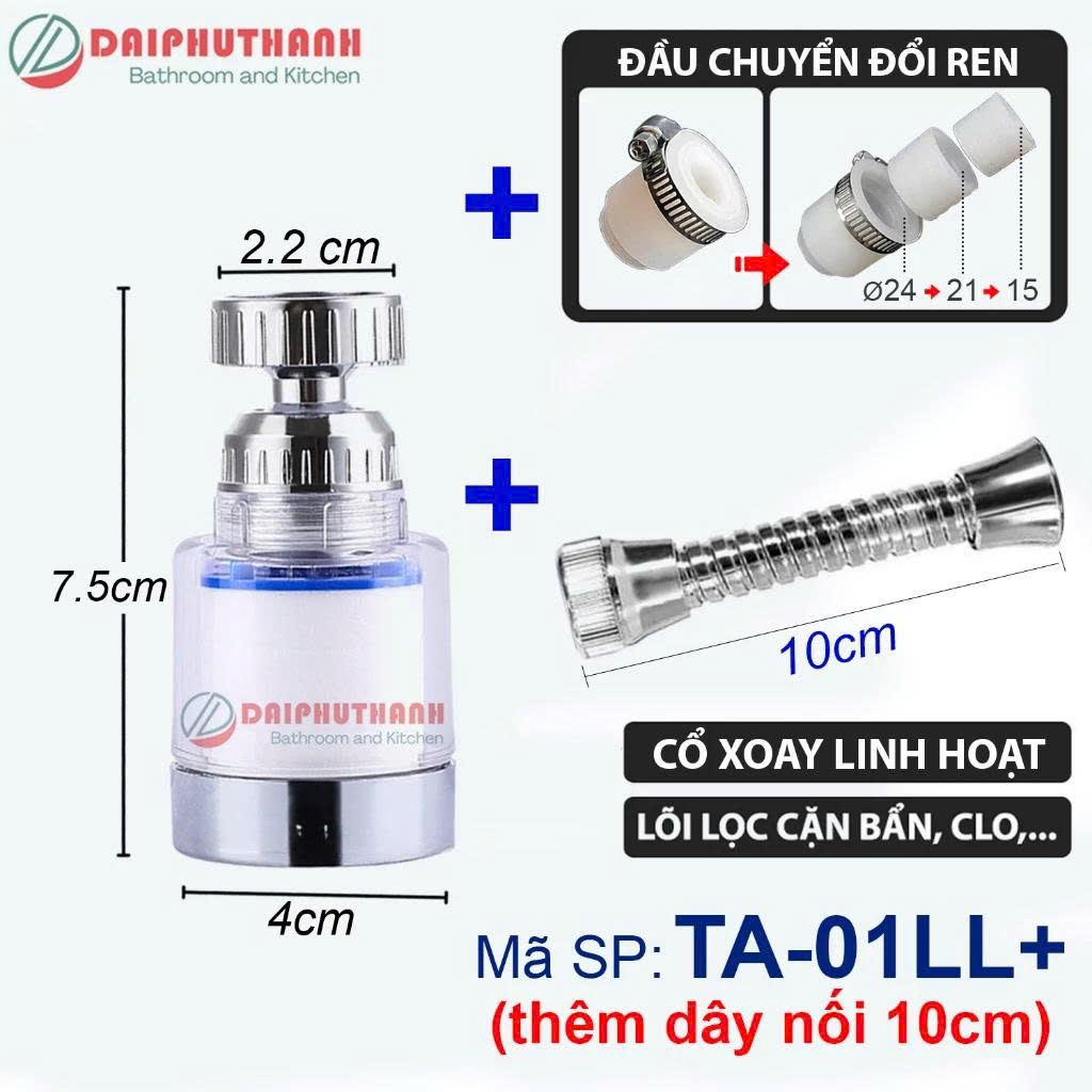 Mẫu 1: Mã TA-01LL: Mẫu đầu vòi tăng áp, có lõi lọc cặn bẩn, clo,.cổ vòi có thể xoay, TẶNG kèm 1 bộ đầu chuyển đổi ren tiện lợi, dùng được cho hầu hết loại vòi có ren đầu xả từ 15 đến 24mm,..