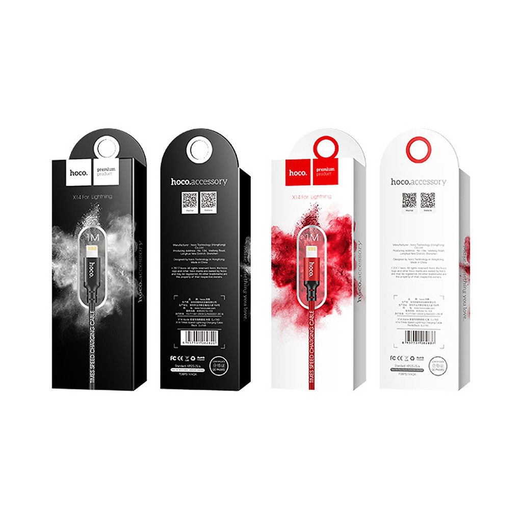 📍Thông số Cáp sạc Hoco X14 Lighting Chiều dài dây: 1m, 2m Điện áp: DC 5V-2.4A Chất liệu: hợp kim aluminum, đồng, nylon dệt kim Màu sắc: đen, đỏ Phù hợp cho iPhone (5, 5S, 6, 6 Plus, 6S, 6S Plus, 7, 7 Plus), iPad (pro, 4 gen, iPad Air, iPad Air 2, iPad mini 1/2/3/4), iPad Pro 2017