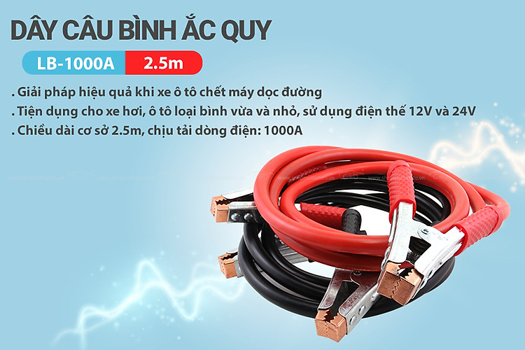 - Dây câu bình ắc quy LB 1000A dài 2.5m là sản phẩm tiện lợi giúp bạn khắc phục sự cố nhanh gọn trong các trường hợp xe bị nổ lốp, xịt lốp, xe chết máy do hết ắc quy, xe bị sa lầy do đường xấu, trơn trượt.