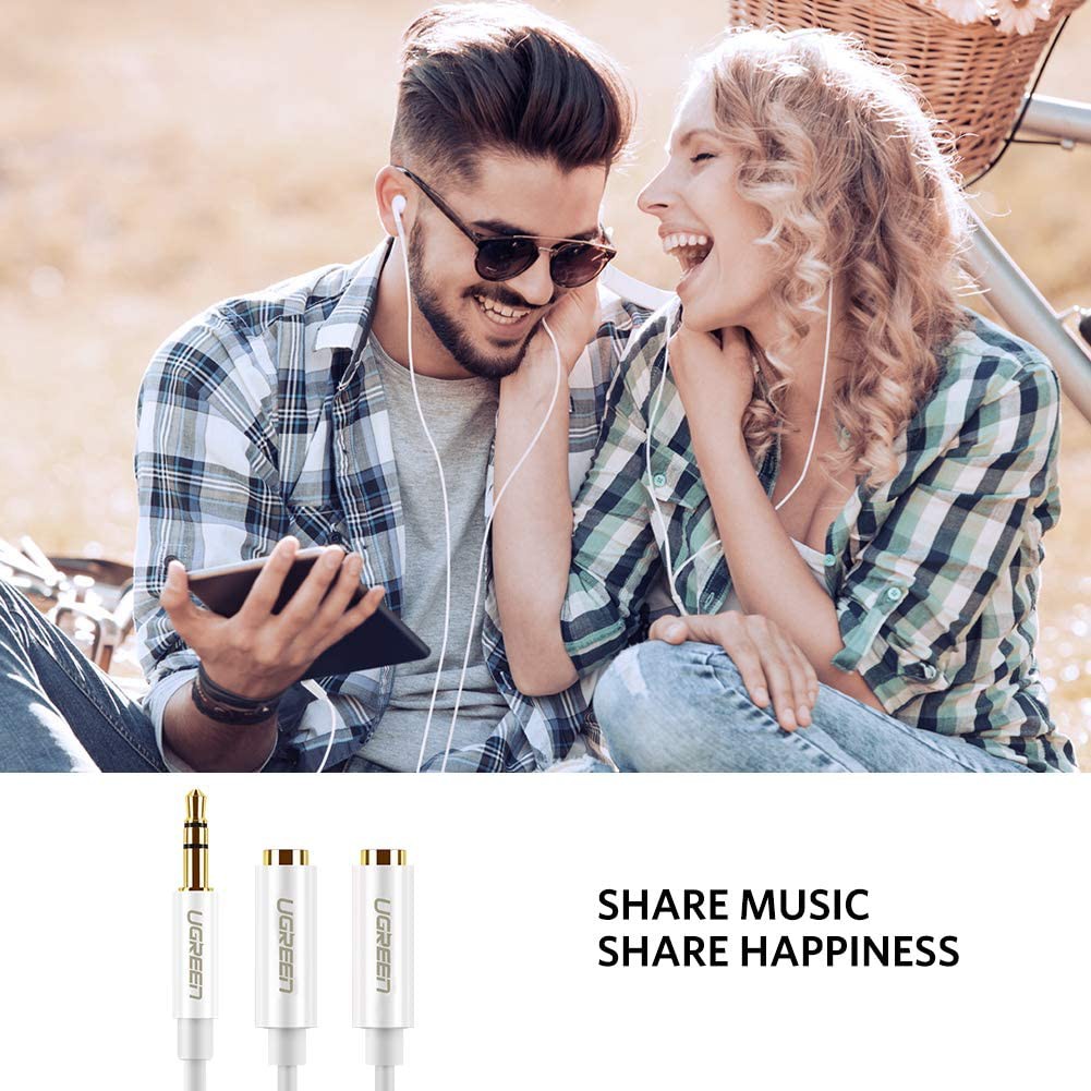 Cáp chuyển đổi âm thanh 1 đầu giắc 3.5mm đực sang 2 đầu 3.5mm cái là sản phẩm chính hãng UGREEN Chuyển đổi một giắc 3.5mm stereo duy nhất ra hai giắc cắm 3,5mm stereo. Cáp chia này cho phép 2 người nghe âm thanh qua 2 tai nghe từ cùng một nguồn mà chất lượng âm thanh không thay đổi. Được dùng cho điện thoại di động, máy nghe nhạc MP3, máy tính bảng, máy tính xách tay, máy tính... chia ra 2 tai nghe hoặc hệ thống âm thanh, dàn âm li trong gia đình... Sản xuất theo dây chuyền công nghệ đạt chuẩn quốc tế Với 3 đầu nối tiếp xúc được mạ vàng 24k giúp tăng khả năng kết nối chuẩn, không bị ảnh hưởng nhiễu sóng từ các tác nhân bên ngoài. Lõi được làm từ đồng nguyên chất hỗ trợ truyền tải tín hiệu âm thanh nhanh chóng, ổn định. Giúp cáp trở nên bền bỉ hơn, có thời gian sử dụng lâu hơn hẳn những loại cáp không chính hãng khác trên thị trường. Thông số kỹ thuật: Đầu vào: 1 cổng audio 3.5mm đực Đầu ra: 2 cổng audio 3.5mm cái Đầu tiếp xúc đều được mạ vàng 24k giúp khả năng kết nối rất chuẩn và không bị nhiễu. Hỗ trợ tất cả các thiết bị có cổng âm thanh 3.5mm Lõi đồng nguyên chất, truyền tải tín hiệu tốt nhất Cáp mềm dễ uốn Màu sắc: trắng/đen Độ dài: 20CM