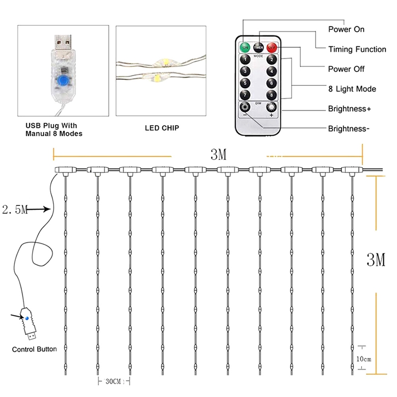 Giới thiệu Dây đèn led 300 bóng 8 kiểu 3x3m chống thấm nước cổng usb trang trí phông nền đám cưới/tường/tiệc giáng sinh/ phòng ngủ
