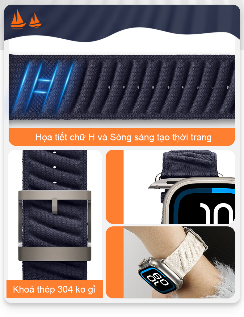 Dây Dệt Nylon kiểu Sóng H cho Apple Watch Series 4/5/6/7/8/9/10/11/SE và Apple Watch Ultra 1/2/3 Size 40/41/42mm & 44/45/46/49mm