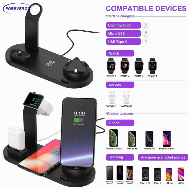 Feature: 4 in 1 Wireless Charger Stand-The multifunctional charging stand with iPhone/Micro/Type-C interfaces can charge for almost all mobile devices, such as iPhone, iPad, Samsung, LG, HTC, Huawei, Sony, and the charging dock can be freely rotated by 360 degrees. Compatibility-Universal Compatible for iWatch series iWatch 4/3/2/1, Airpods and iPhone Xs/Xs Max / Xr / X / 8/8 Plus/Samsung Galaxy S10/S10 Plus/ S9 / S9 Plus / S8 / S8 Plus / S7 / S7 Edge / S6 Edge Plus / Note 9 / Note 8. Charge Forward-The charging station uses the most advanced automatic control technology. Built-in safeguards against overcharge, overcurrent and overvoltage protection, temperature control, foreign object detection. Guards your device battery against overcharge damage. Best Quality-Innovative Silicone Material,Without scratching of your iphone/iwatch/airpods blocking the screen or edge. Perfectly decorates your bedroom, study, hall, office desk . Easy Installation-Just Install the original apple cable into the stand, then it can work as charging stand for you. Hide the long redundant cables, make your desk or nightstand neatly and orginazed. Description: Colors: Black/White Input: DC5V-3A, 9V-1.8A Charger output: DC 5V-1.5 A Wireless charger output: 10W USB cable length: 1.2 meters Product size: 230 * 90 * 57.5mm Package Included: 1 x Wireless Charger 1 x USB Cable 1 x User Manual