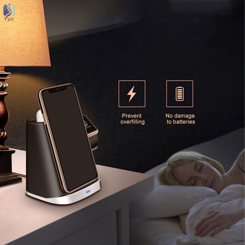 ---------------------Yyci.vn------------ Decription: Description: 1.Smart charging protection, overtemperature, overcurrent, shourt circuit protection, its low temperature during charging, you need not worry about damaging to the phone 2.It has a built-in smart chip, Over temperature/current/short-circuit protections offer you the safe charging 3.The charger sensing distance is 3-8mm 4.Your mobile phone is allowed to put down on the wireless charger and then charge automatically. Say goodbye to tedious wires 5.Suit for wireless charging smartphone, smart watch, headset, etc. Details: Style 3-in-1: phone charger, watch charger and headset charger Style 2-in-1: phone charger and Storage Box Specification: Current: 1000mA Voltage: 9V Power: 5W/7.5W/10W; 2W(Watch) Size: 22x12x4cm Included: 1x wireless charger 1x charging cable 1x manual