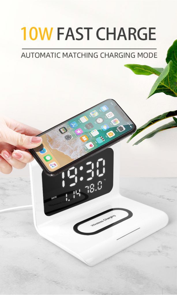 Description: Product Name: Clock Perpetual Calendar Wireless Charger Maximum current: 1.8A Color: White/Black Material: zinc alloy + PC Charging tips: red light/charging, green light/charging completed Interface: TYPE-C Input: 9V/5V Support 5V-3A general charging, 9V-3A fast charging two charging modes, fast charging does not hurt the machine Temperature protection, automatic protection when the battery is at high temperature Short circuit protection automatically cut off when short circuit, current protection