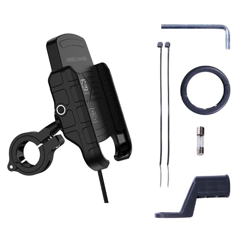 Package includes: 1x Motorcycle wireless charger Mount Holder. 1x Rear view mirror base 1x Allen key 1x fuse 2x Plastic pad 2x Cable tie