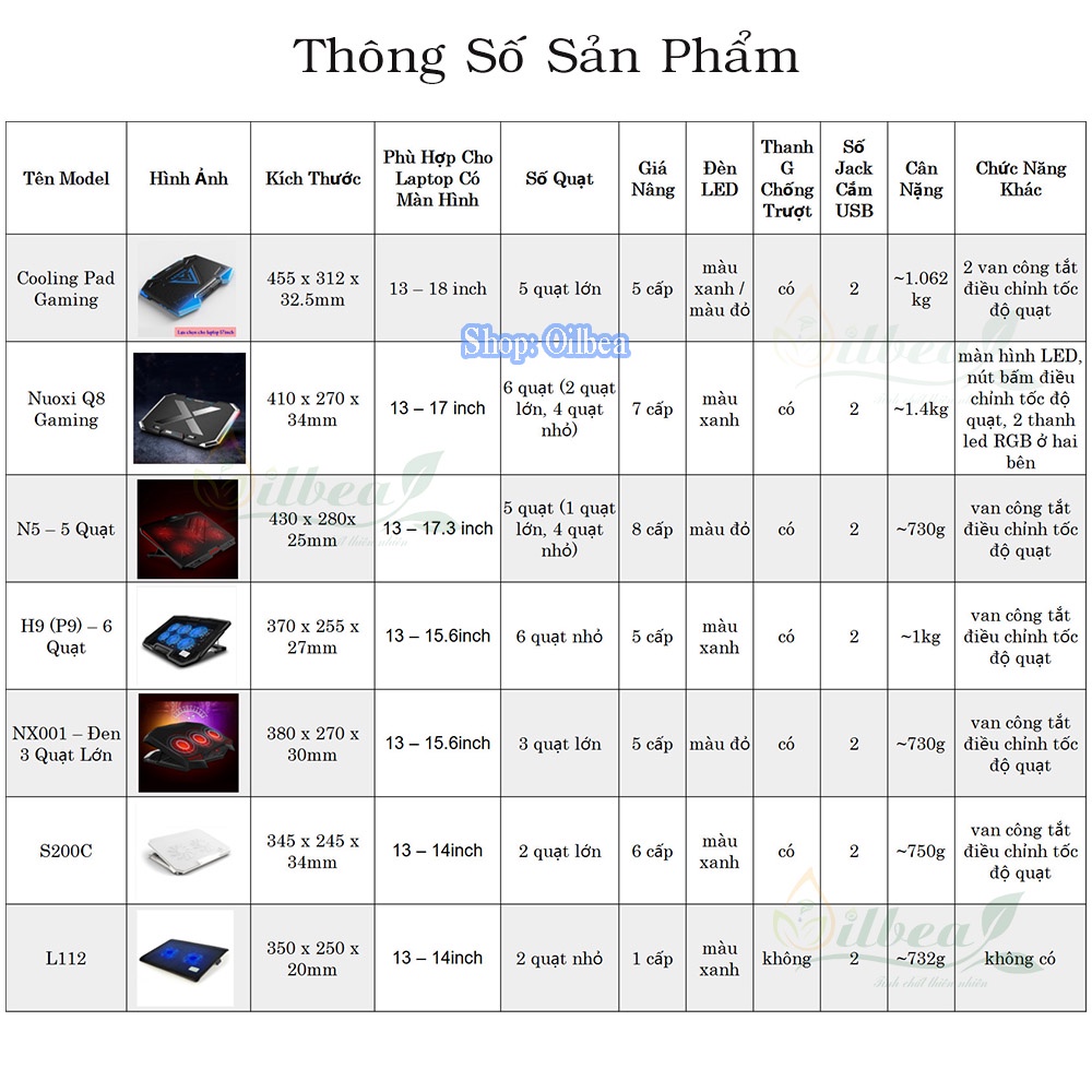 - Model Nuoxi H9: + Kích thước sản phẩm: 370 * 255 * 27MM + Sử dụng cho laptop: 13 - 15.6 inch + Số quạt: 6 quạt + Trọng lượng: ~1kg + Ánh sáng LED: màu xanh + Giá nâng: 5 cấp