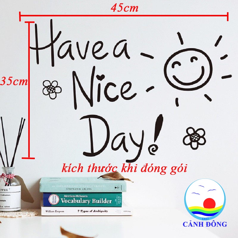 Đầy sang trọng và lịch lãm, dễ thương Kích thước tấm decal trước khi dán 33 cm x 45 cm Kích thước thành phẩm sau khi dán lên tường : Bạn có thể điều chỉnh theo sở thích của bạn Không chỉ là giấy dán tường trang trí nội thất bình thường mà đặc biệt hơn giấy dán tường còn là những câu nói truyền động lực cho cả gia đình bạn hay một tập thể trong công ty HAVE A NICE DAY – CHÚC MỘT NGÀY TỐT LÀNH Giấy dán tường chữ HAVE A NICE DAY được làm từ chất liệu nhựa PVC trong suốt, thân thiện môi trường và chống thấm nước tốt. Cuộc sống không gian gia đình và công ty bạn sẽ trở nên năng động và tràn đầy năng lượng khi sử dụng giấy dán tường chữ HAVE A NICE DAY, tinh thần của bạn và mọi người xung quanh sẽ được tràn đầy năng lượng đón chào ngày mới một cách tích cực, thoải mái và vui vẻ nhất Đôi khi một câu nói cũng đã giúp bạn khắc cốt ghi tâm và nhớ nó đến suốt đời. Có thể là một câu truyền động lực, một lời nhắn nhủ, một lời tâm tình mà chính bản thân bạn và mọi người xung quanh dành cho mình. Hãy đón chào ngày mới với sự vui vẻ và tràn đầy năng lượng cho một ngày làm việc, học tập tích cực và hiệu quả