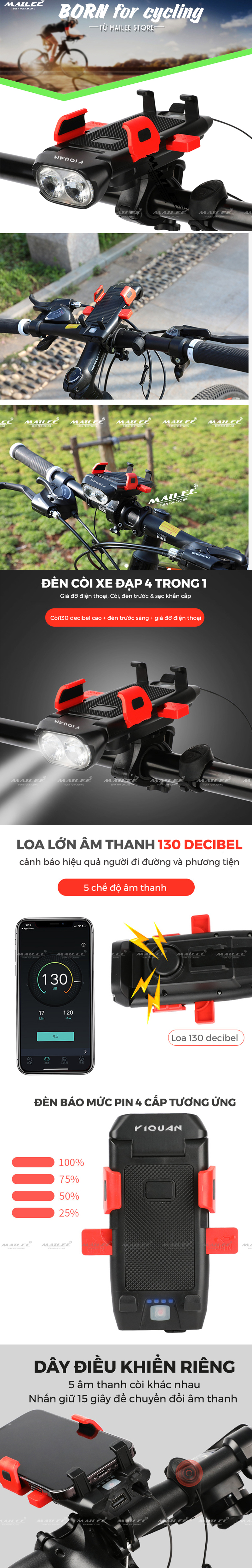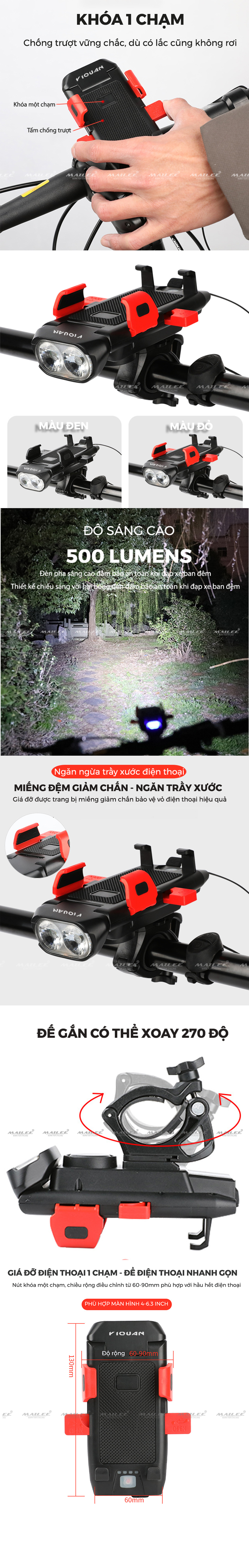 Có 3 chế độ sáng (cao/thấp/nháy), 5 chế độ còi, giá đỡ điện thoại 4-6.3 inch, và còi 130dB.