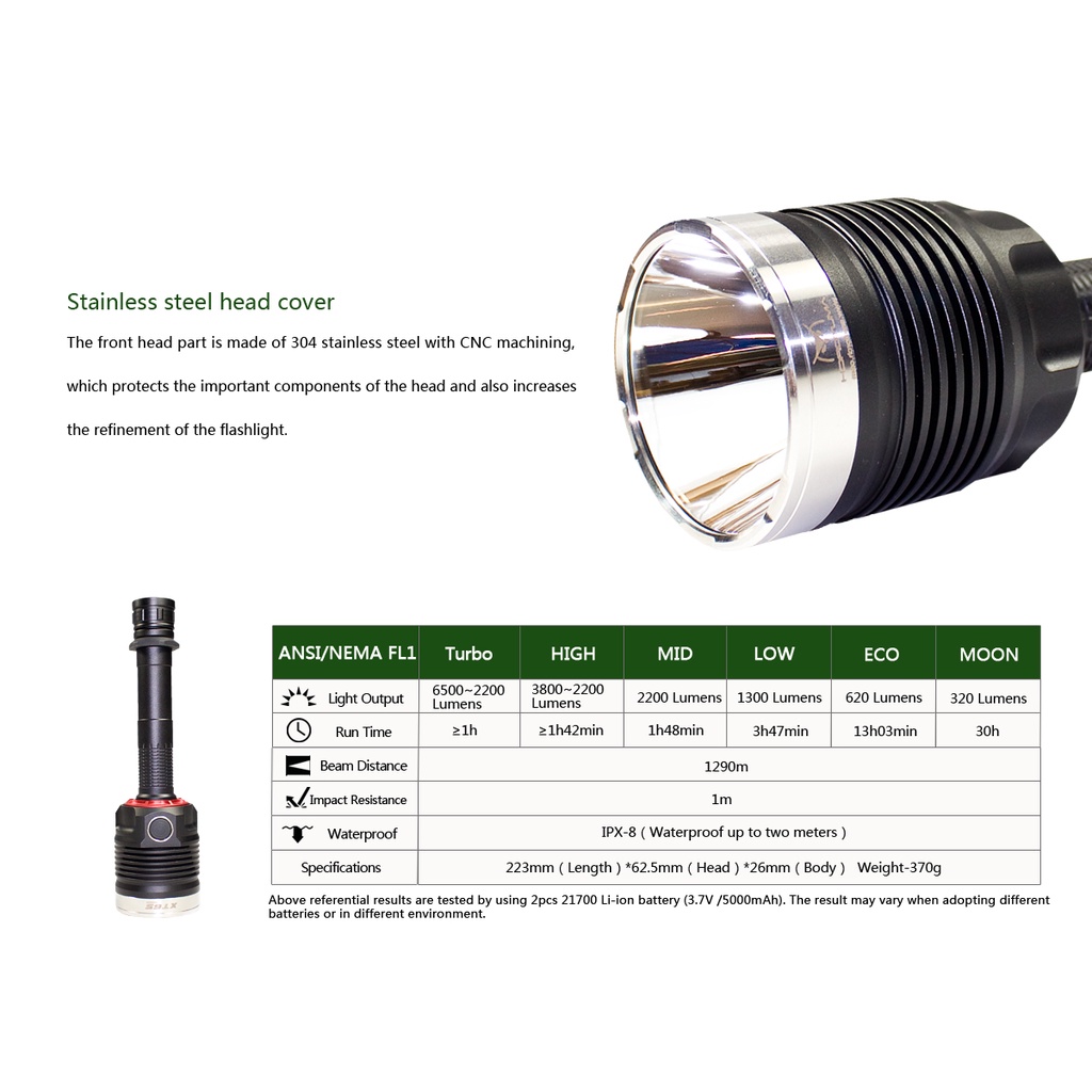 Thông số chi tiết của đèn pin chiếu xa: Sử dụng 1 LED Luminus SBT-90.G2 Độ sáng tối đa đạt 6500 lumen Đèn ánh sáng trắng Tầm chiếu xa lên tới 1290m (Theo tiêu chuẩn quốc tế về đèn pin (ANSI PLATO FL1) cách 1290m ánh sáng chiếu đến mạnh như ánh sáng mặt trăng, đèn có thể soi rõ vật ở 645m đổ lại) Đèn sử dụng 2 pin sạc Amutorch 21700 dung lượng cao 5000mAh Thân đèn được gia công từ hợp kim nhôm hàng không, được hoàn thiện anodized HA III chuẩn qu-â-n s-ự Chóa trơn giúp ánh sáng được phản xạ toàn phần Thấu kính cường lực siêu trong giúp nâng cao hiệu suất chiếu sáng Hệ thống điều khiển nhiệt độ thông minh, tự động hạ sáng khi nhiệt độ ở LED vượt quá ngưỡng cho phép Thời gian hoạt động liên tục có thể lên tới 30 tiếng Vòng viền kính ở đầu LED làm từ thép không gỉ 304, cứng cáp, hoàn thiện CNC Giao diện thân thiện, thao tác điều khiển dễ dàng với công tắc đơn làm bằng cao su ở thân đèn Chỉ số chống nước IPX8 (2m) Chịu va đập tốt ở độ cao 1m Kích thước: 223mm (Chiều dài đèn) x 62.5mm (đường kính đầu đèn) x 26mm (Thân đèn) Khối lượng: 337g (chưa kèm pin) Đèn phù hợp cho các hoạt động chuyên dụng như tìm kiếm cứu hộ, tá-c chiế-n, tu-ần tr-a, a-n ni-nh, thám hiểm, dã ngoại, .... Bảng đo thời gian sử dụng: Turbo: 6500 lumen; 1 tiếng; 1290m High: 3800 lumen; 1 tiếng 42 phút Mid: 2200 lumen; 1 tiếng 28 phút Low: 1300 lumen; 3 tiếng 47 phút Eco: 620 lumen; 13 tiếng Moonlight: 320 lumen; 30 tiếng