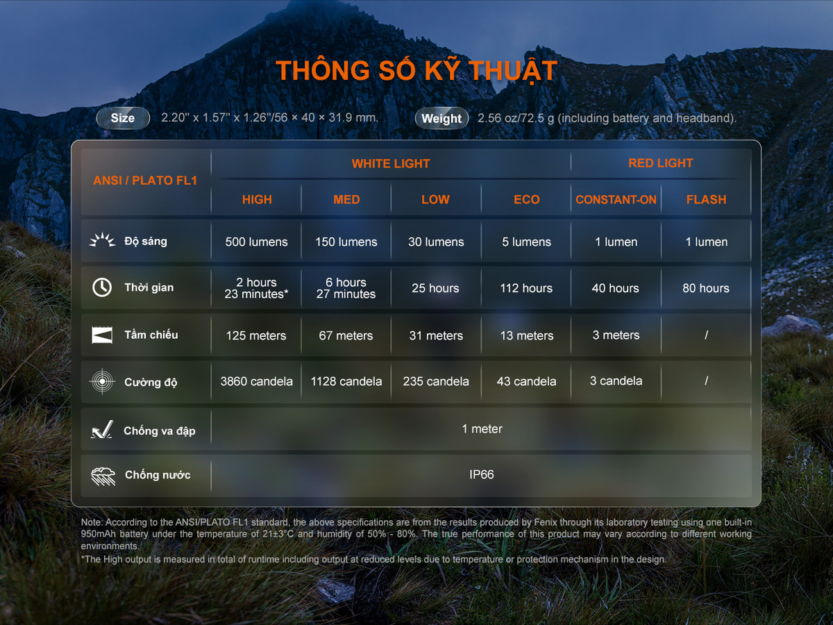 LED trắng với công suất tối đa 500 lumens, chiếu xa 125 mét, phù hợp cho việc chạy đêm, trekking hoặc tìm đường.