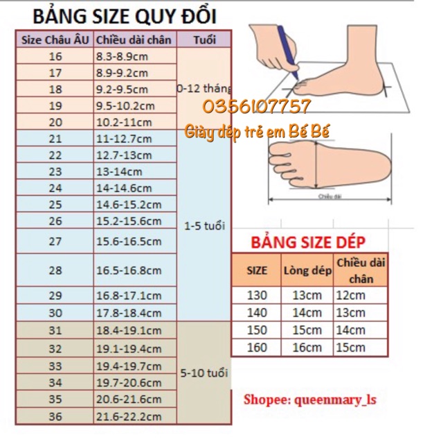 * Lưu ý: Để chọn size dép cho bé, mẹ vui lòng đo dài chân con từ gót đến ngón dài nhất theo chiều thẳng đứng ạ. Đối với các bé có bàn chân dày hoặc bề ngang rộng các mẹ nên lấy tăng lên 1 size nhé! Không trừ hao không sẽ bị rộng ạ ------ 🌿CAM KẾT và CHẾ ĐỘ BẢO HÀNH DÉP CHO BÉ: ✔ Chất liệu và kiểu dáng đúng như mô tả. ✔ Đổi trả trong vòng 3 ngày kể từ ngày nhận hàng. ✔ Sản phẩm đổi trả phải còn #nguyên_tem, nhãn, bao bì. Chưa qua sử dụng, giặt tẩy. ✔ Sản phẩm lỗi kỹ thuật được đổi mới. ---------------------------------------------- SỈ/CTV vui lòng ib để có giá sỉ tốt nhất