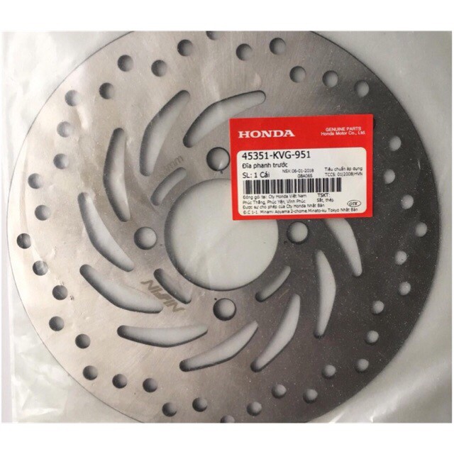 - Đĩa phanh xe máy được sản xuất trên dây truyên hiện đại của Nhật Bản. Phù hợp với tiêu chuẩn kỹ thuật và chất lượng của Honda. - Sản xuất bằng thép không gỉ nguyen khối. có độ bền cao và độ bám dính tốt. - Sản phẩm an toàn, bền đẹp - Sản phẩm được bảo hành chính hãng 6 tháng trong trường hợp rỉ sét do thời tiết - Má phanh mòn không chỉ làm mất độ bám mà còn kéo theo sự hư hại của đĩa phanh. Khi phần phíp (lớp dán vào xương sắt của má phanh) mòn, má phanh khi tiếp xúc với đĩa phanh sẽ tạo nhiệt độ cao, làm cong vênh, mài mòn đĩa phanh.