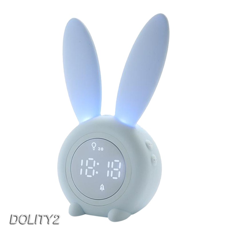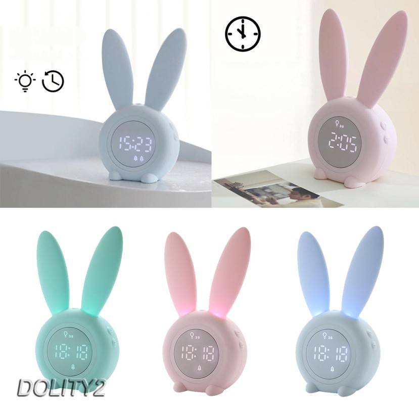 Description: PERFECF KIDS GIFT: Cute rabbit design, environmentally friendly and safe silicone material, 6 built-in music, 5 levels adjustable sound volume, perfect as holiday or birthday gift for boys and girls. DUAL ALARMS: The rabbit clock supports to be set two different alarms in working day and weekend, it's great for the whole family. It also have snooze function, you can control it by shaking and sound, it will continue to ring in five minutes 6 built in music to choose from, thermometer, 5 level adjustable sound volume. SMART SOUND/TOUCH CONTROL: You can set 30 minutes / 60 minutes to accompany the sleep mode, you are free to choose and activate the alarm screen display by making a sound louder than 56 dB(clap), touch or shake the clock. The display screen will light up while sound is detected, and will go out automatically 15 seconds later. KIDS SLEEP TRAINER: The goal of the sleep trainer alarm clock is to help teach your child regular sleep habits. This may be quite the task, but the soft rabbit design desk clock adds some fun to the bedroom, especially, once they learn to sleep alone. EASY MOUNTING: The alarm clock can be placed at will, freestanding, lying or hanging on the wall, with strong adsorption. The digital alarm clocks use rechargeable lithium-ion battery, It is more eco-friendly. Specification: Product Name: Funny Rabbit Kids Alarm Clock Night Light Size: 6.9 x 3.7 x 2.5 inch Material: ABS + silicone Rated Voltage: DC5V Rated Power:≤1W Rated Current: 500mA Battery Capacity: 2000MA Lithium Battery Package Includes: 1x Kids Alarm Clock Night Light 1x USB Cable 1x User Manual
