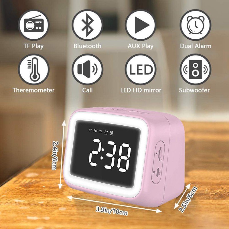ern design and mirror surface-ern alarm clocks with mirror surface and stylish design are perfect for home decoration. The LED screen displays clearly. Sometimes it can also be used as a mirror to keep beautiful anytime, anywhere. Large display and night light-large LED screen. You can easily capture numbers from a distance, and you can read them from all angles. Uniquely increase the night light effect, so you no longer worry about the coming of night. Dual alarm clock-allows you to wake up in the morning and fall asleep at night, you can independently set and use dual alarm clocks, bid farewell to traditional alarm clocks Four playback es-AUX connection/ 2. TF card playback/ 3. Audio line input/4. FM radio (optional) Built-in large-capacity rechargeable lithium-ion battery, providing up to 4 hours of working time, very suitable for families, parties, picnics, travel, etc. Name: Mirror Alarm Clock Power e: USB rechargeable (including data cable) Charging time: 2H Voltage: 5V Switching method: manual Bluetooth version: 5.0 Effective distance: 1-10 meters Alarm clock: dual alarm clock Alarm: 3 groups Functions: time display, temperature display, alarm clock, TF playback, AUX playback, Bluetooth speaker, night light, mirror, hands-free call Colour:Pink / red Material:ABS Size:103 x 81 x 70mm