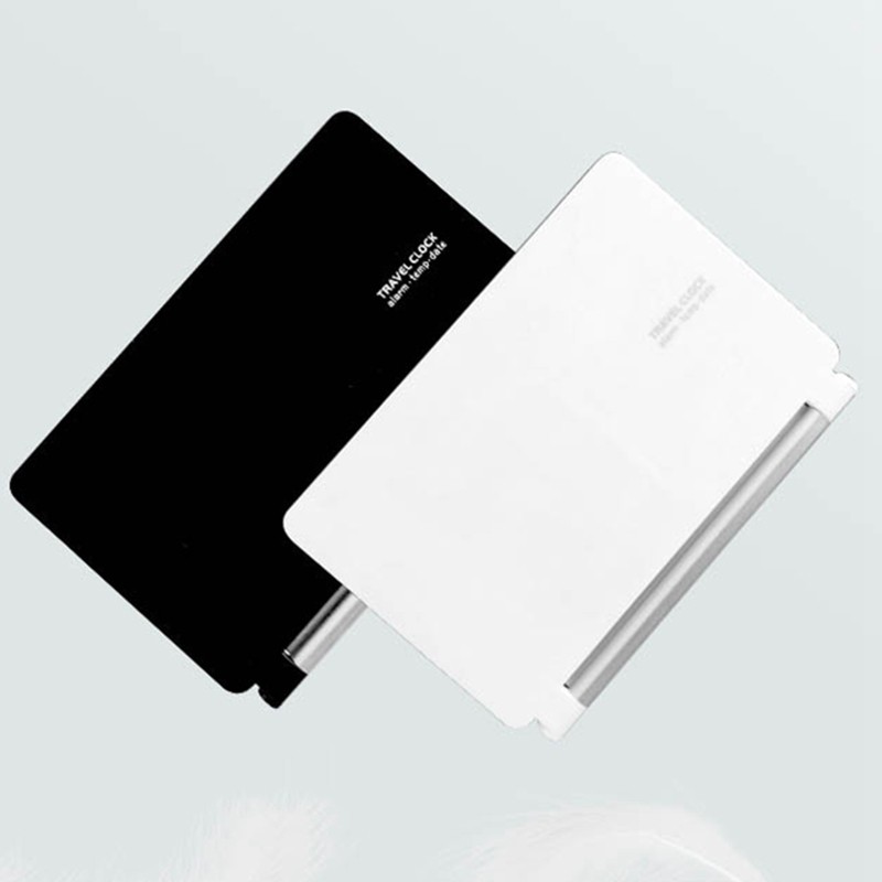 Simple and Stylish Design. Back Function Keys: Easy to understand, easy to adjust and setting. Alarm, , Calendar Display, Date Display and Snooze Function, so you can sleep worry-free. Ultra-thin Clamshell Design, Compact Size, Including a leather protective sleeve, Easy to carry and protect when traveling. 12/24 Hours Clock, World Time Table Travel Clock, Hours&minutes Display, the large LCD screen show you the clear information. Warm tips: This Alarm Clock is power-saving design, so it doesn't equip with Backlight. Colour: black/white/red Material: plastic Size: 104x64x16mm