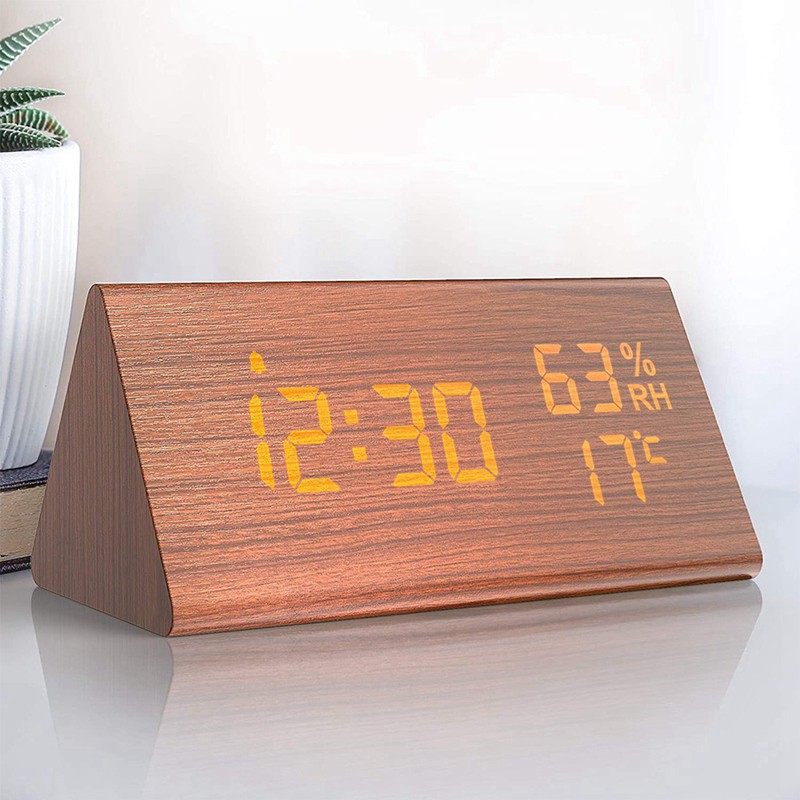 [Multifunction] Display of time, date, temperature, humidity and 3 alarm functions, LED display via voice or Press control function with acoustic sensor. [3 alarm groups] You can either set three al to wake you up better and you won't miss a time or meeting. You can also set the weekday e, which only rings from Monday to Friday. The size of the alarm ringtone can be adjusted. [5 brightness level adjustable] With this option you can adjust the brightness between low and high brightness or even turn off the LED light and keep the sound sensitive. It's easy to use at night, which isn't too difficult for your eyes [Monitor temperature and humidity] Use the alarm clock kinder to monitor the temperature and humidity in the children's room, bedroom or living room. This allows you to set a thermostat or humidifier to maintain your Perfect living environment and protect your health. [Delicate Design] With wooden structure, fine craftsmanship and white LED light display. Usable for home, kitchen, bedroom, study and other interiors. It is a perfect Christmas present for children and their friends.
