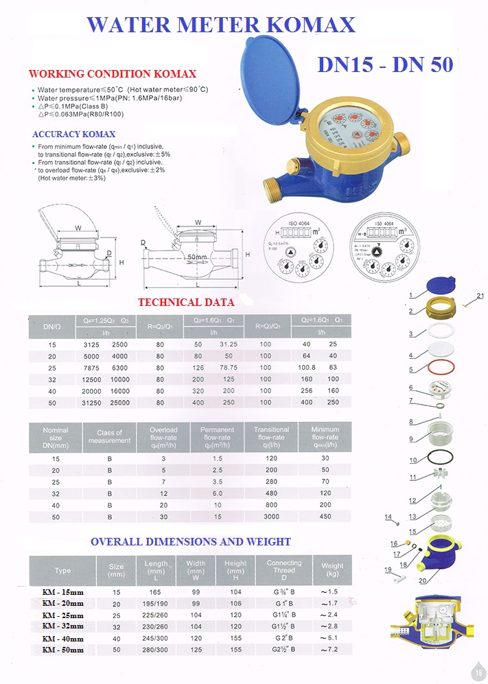 | Hướng dẫn sử dụng | HƯỚNG DẪN SỬ DỤNG ĐỒNG HỒ NƯỚC AN TOÀNKính gửi: Quý khách hàng.Chúng tôi xin cám ơn Khách hàng đã sử dụng Đồng hồ nước KOMAX. Dưới đây chúng tôi xin gửi tới quý khách:Lắp đặt theo phương nằm ngang, Mặt đồng hồ nước hướng lên trên vuông góc với mặt đất, lắp mũi tên trên thân đồng hồ theo chiều nước chảy.Tránh rung lắc hay va đập mạnh tới đồng hồ.Nên gắn kèm van cổng, van 1 chiều, Y lọc và racco để ổn định dòng chảy cũng như tiện cho việc thay thế, bảo trì.Lắp cho nước đầy ống ngập hết cánh quạt để đảm bảo độ chính xác.Không lắp đồng hồ ở nơi có nhiều tạp chất hay nguồn nước bẩn.Không sử dụng vượt quá nhiệt độ cho phép.Sử dụng áp lực quá cao hay tốc độ dòng chảy quá mạnh ảnh hưởng đến độ bền và độ chính xác của đồng hồ nước.Tùy thuộc kích cỡ đường ống và lưu lượng dòng chảy để lựa chọn đồng hồ phù hợp, tránh trường hợp lưu lượng quá nhỏ hay quá lớn ảnh hưởng tới sự vận hành của đồng hồ nước.Tiêu chuẩn chất lượng : ISO 4064Áp lực : 16kg/cm2Nhiệt độ sử dụng : 50’CCHÂN THÀNH CÁM ƠN KHÁCH ĐÃ SỬ DỤNG SẢN PHẨM |