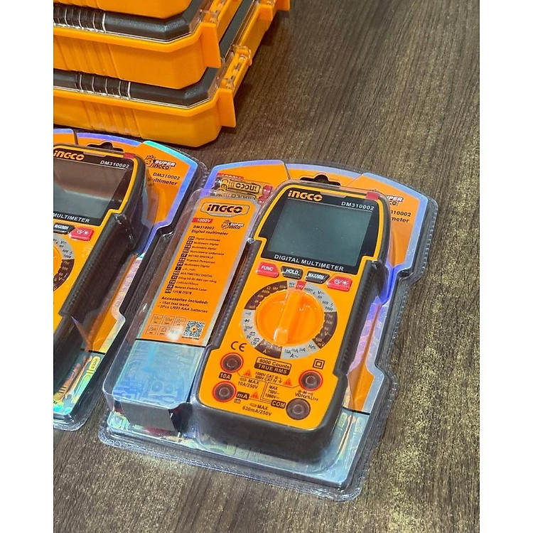 Đồng hồ vạn năng kỹ thuật số INGCO DM310002 là một thiết bị đo lường chuyên nghiệp, được thiết kế để đo điện áp AC/DC lên đến 1000V và nhiều thông số điện khác. Sản phẩm này có màn hình hiển thị 6000 số đếm, mang lại độ chính xác cao trong các công việc lắp đặt, bảo trì và sửa chữa hệ thống điện. Thông số kỹ thuật Theo thông tin từ nhà sản xuất INGCO và các nhà phân phối chính hãng như và , đồng hồ vạn năng INGCO DM310002 có các thông số kỹ thuật chính như sau: Điện áp hoạt động: Thường sử dụng pin (ví dụ: 2xAAA hoặc 3xAAA). Điện áp đo: AC/DC: Lên đến 1000V. Dòng điện đo: Có thể đo dòng điện AC/DC (tùy phiên bản chi tiết). Màn hình hiển thị: 6000 số đếm (counts), hiển thị rõ ràng và chi tiết kết quả đo. Các chức năng đo khác: Đo điện trở (Resistance). Đo tần số (Frequency). Đo điện dung (Capacitance). Kiểm tra diode và liên tục (continuity buzzer). Tính năng bổ sung: Chức năng NCV (Non-Contact Voltage) phát hiện điện áp không tiếp xúc. Chức năng giữ dữ liệu (Data hold). Đèn nền màn hình (backlight), tiện dụng khi làm việc trong điều kiện thiếu sáng. Chỉ báo pin yếu và tắt nguồn tự động. Thiết kế: Nhỏ gọn, chắc chắn, với vỏ bảo vệ chống sốc.