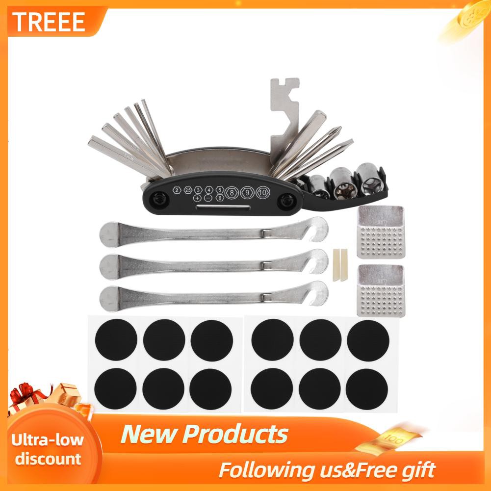 Feature: 1. The portable bicycle repair kit includes a 16‑in‑1 multi‑function tool, 3 steel tire levers, 12 glueless tube patches, 2 metal RASP, 2 valve cores and 1 portable tool pouch. 2. It helps to solve various problems when riding a bicycle, it can also be used for basic maintenance when not riding a bicycle, or it can be used as a daily home maintenance tool alone. 3. 16 in one multi‑functional tools includes allenwrench 8/9/10/ mm, slotted screwdriver, cross screwdriver, socket extension rod, solid wrench 8/10/15/mm and hex wrench 2/2.5/3/4/5/6mm. 4. The tire lever kit can help you quickly and easily disassemble the tire and repair the puncture, the self‑adhesive tire patch is easy to use, just use a file to sharpen the tire, and then firmly paste the patch to the punctured area without extra glue. 5. Portable tool bag, compact to fit into your bag or pocket, the back of the bag is equipped with a nylon belt loop, which can be worn on the belt, with this bag, it can help you solve most bicycles when riding outdoors problems.