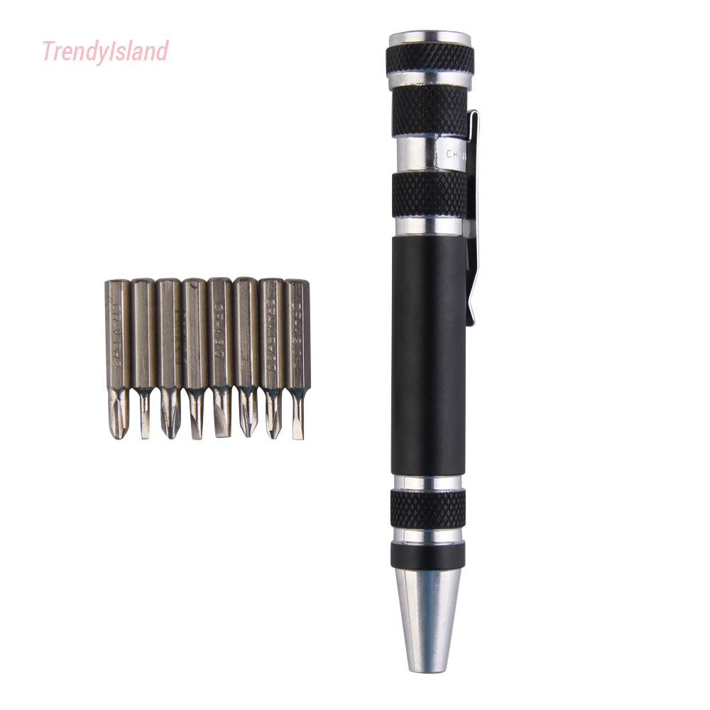 Features: 100% Brand New and high quality. Portable precision screwdriver set Compact, portable design, elegant look Non-slip cap with engraved pattern Engraved pattern promises comfortable touch and labor-saving performance Made of high quality aluminum alloy Includes drivers bits for different purpose It is the perfect addition to your tool collection Color: Blue/Black/Silver/Red/Purple Size (L x W x T): 110 x 15 x 15 mm How to use: -- Turn to open the cap -- Choose a suitable bit from the 8 different ones stored inside -- Set the bit into the top end of the driver. It can be held in position by the built-in magnet -- The screwdriver is then ready to use