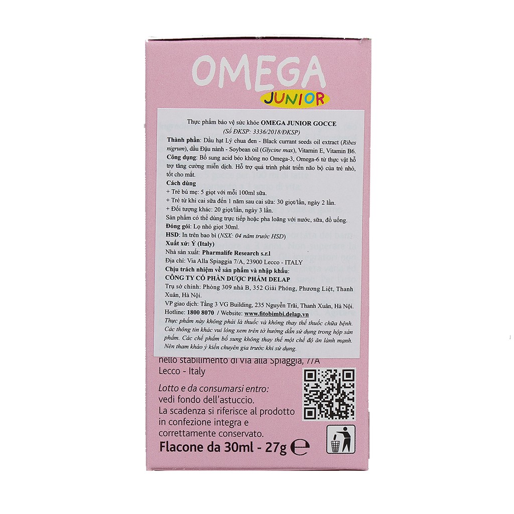 ✅ Chú ý : " Sản phẩm ko phải là thuốc và không có tác dụng thay thế thuốc chữa bệnh " ✅ Công dụng: - Bổ sung acid béo không no Omega-3, Omega-6, Omega-9 từ thực vật hỗ trợ tăng cường miễn dịch. Hỗ trợ quá trình phát triển não bộ của trẻ nhỏ, tốt cho mắt. ✅ Thành phần: - Dầu hạt Lý chua đen – Black currant seeds oil extract (Ribes nigrum), dầu Đậu nành – Soybean oil (Glycine max), Vitamin E, Vitamin B6. ✅ Đóng gói: - Lọ nhỏ giọt 30ml tương đương khoảng 600 giọt. ✅ Đối tượng sử dụng: - Trẻ đang trong độ tuổi phát triển. ✅Cách dùng: - Trẻ bú mẹ: 5 giọt với mỗi 100ml sữa. - Trẻ từ khi cai sữa đến 1 năm sau cai sữa: 30 giọt/lần, ngày 2 lần. - Đối tượng khác: 20 giọt/lần, ngày 3 lần. - Trẻ dưới 2 tuổi tham khảo ý kiến chuyên gia y tế trước khi sử dụng. - Sản phẩm có thể dùng trực tiếp hoặc pha loãng với nước, sữa, đồ uống. - Liệu trình sử dụng tối thiểu 1 tháng, có thể kéo dài tới 3 tháng. ✅ Chú ý: Thực phẩm này không phải là thuốc và không thay thế thuốc chữa bệnh. - Thực phẩm có thể có lắng cặn, lắc kỹ trước khi sử dụng. - Các chế phẩm bổ sung không thay thế một chế độ ăn lành mạnh. - Nên tham khảo ý kiến chuyên gia trước khi sử dụng. ✅ Bảo quản: Để nơi lạnh, khô ráo. Để xa tầm tay trẻ nhỏ. ✅ HSD: In trên bao bì. ✅ NSX: 04 năm trước HSD. ✅ Xuất xứ: - Xuất xứ: Ý (Italy) ✅ Sản xuất tại: Pharmalife Research s.r.l ✅ Địa chỉ: Via Alla Spiaggia 7/A, 23900 Lecco – ITALY ✅ Chịu trách nhiệm, nhập khẩu và phân phối sản phẩm: CÔNG TY CỔ PHẦN DƯỢC PHẨM DELAP - Địa chỉ trụ sở chính: Biệt thự số L09, lô đất L11, Khu đô thị mới Dương Nội, P. La Khê, Q. Hà Đông, Hà Nội Số ĐKSP: 3336/2018/ĐKSP