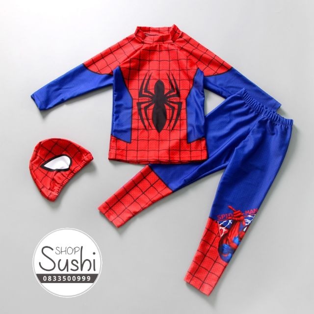 Bộ bơi bé trai dài tay, quần dài hình Người nhện kèm mũ.