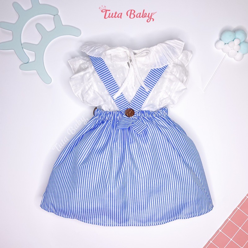 Giới thiệu Set Bé Gái Váy Yếm Sọc Xanh Phối Áo Thô Đũi Trắng FREESHIP Đồ Bộ Cho Bé Gái 8 Đến 22kg