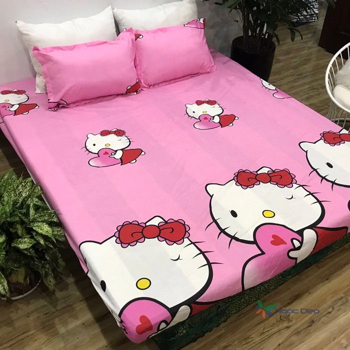 Bộ ga gối poly cotton mẫu Hello Kitty nháy mắt m2, m6, m8, 2m2 và áo gối ôm.