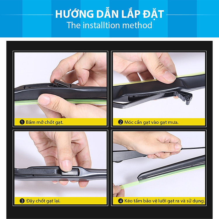 - Hướng dẫn sử dụng: Lắp đặt vào bộ phận gạt nước phía trước kính chắn gió.