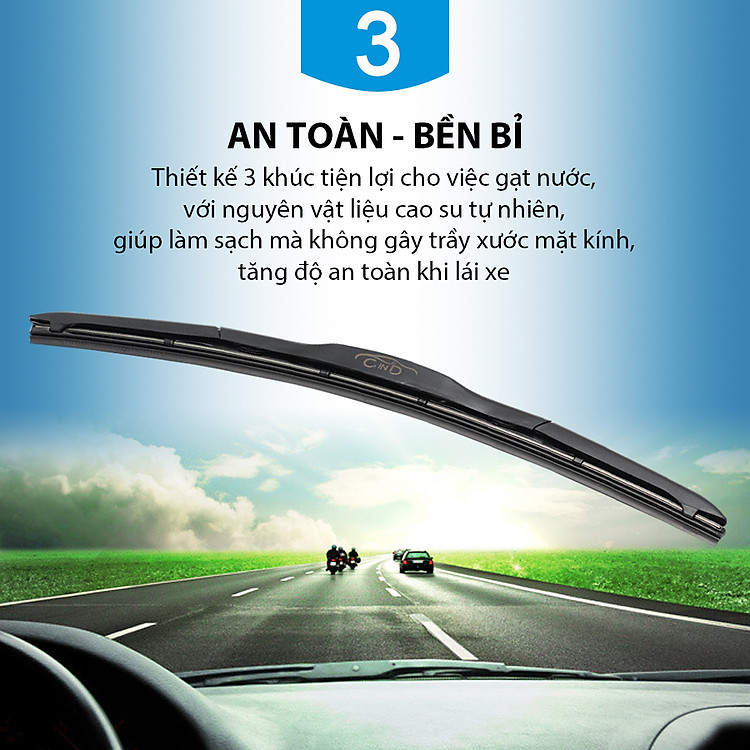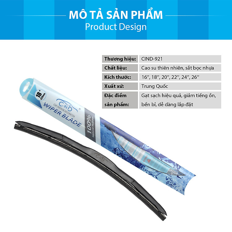 Gạt mưa 3 khúc CIND 921 (26 inch/650 mm) có thiết kế 3 khúc tiện lợi giúp làm sạch bề mặt kính một cách hiệu quả với hiệu suất 100% mà không gây tiếng ồn hay làm trầy xước bề mặt kính.
