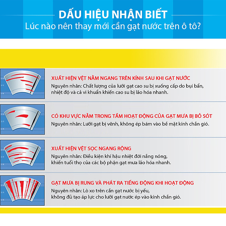 - Gạt nước xe bạn đã cũ, cứng, cần được thay mới, hoặc cũng có thể nguyên nhân là bạn đã không sử dụng loại cần gạt phù hợp cho chiếc xe của mình.