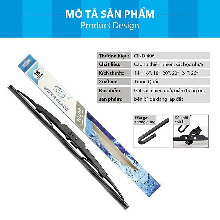 Gạt mưa gọng sắt CIND 406 (16 inch/400 mm) được nghiên cứu và chế tạo bởi công nghệ tiên tiến, với nguyên liệu sắt dày, bền chắc và được bọc nhựa bên ngoài có tác dụng chống rỉ sắt rất tốt. Lưỡi gạt được làm từ 100% cao su thiên nhiên nên giúp tẩy sạch nước bám trên mặt kính một cách hiệu quả mà không làm trầy xước mặt kính.