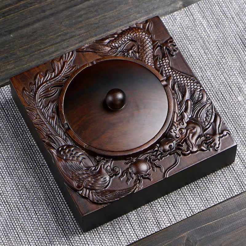 Giới thiệu Gạt tàn thuốc lá hình RỒNG & PHƯỢNG gỗ mun tự nhiên nguyên khối đục CNC chống cháy