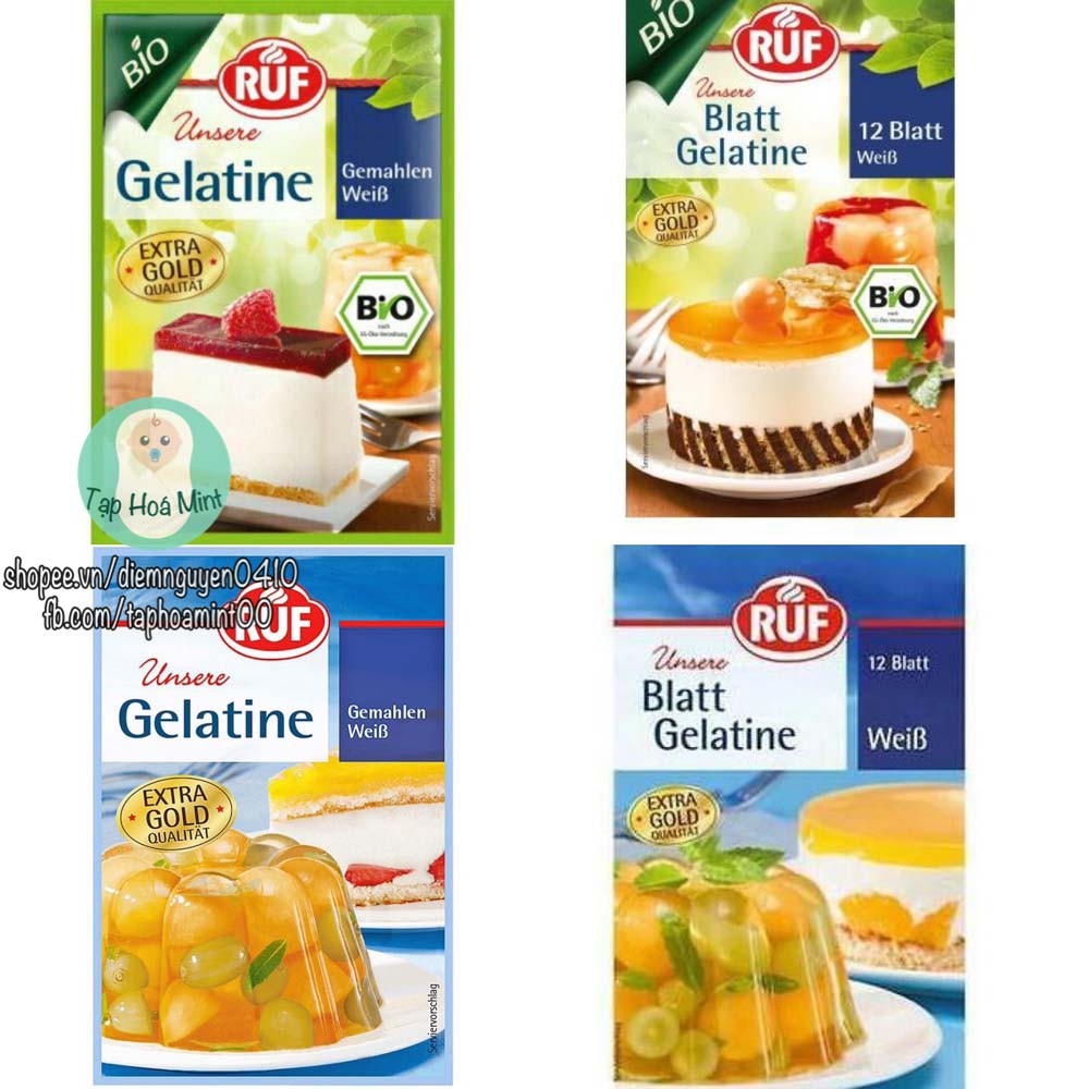 Gelatine RUF hữu cơ - gelatin của Đức: - KHÔNG MÙI, KHÔNG BẤT KỲ CHẤT HÓA HỌC NÀO - THÀNH PHẦN: 100% bì heo nuôi organic (heo ăn thức ăn organic). - TL: 9g/ gói - Dùng để làm đông thực phẩm khi làm bánh... - Có chứng chỉ hữu cơ châu Âu Bio Eu.