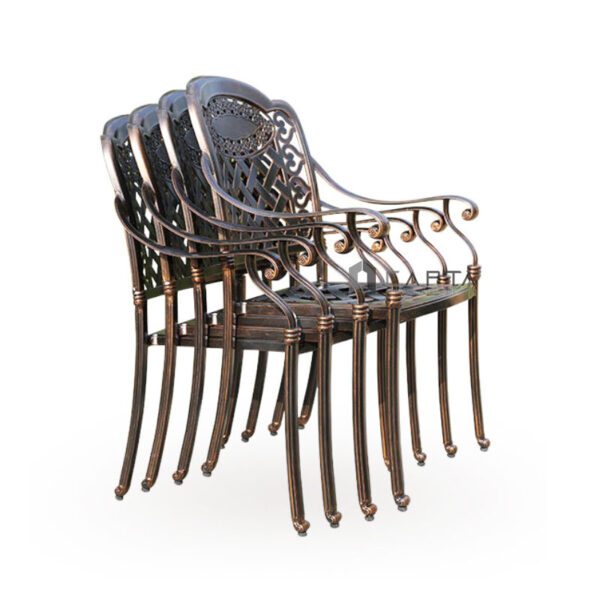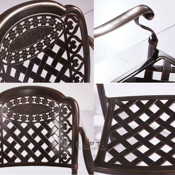 Mẫu ghế nhôm đúc này có kiểu dáng vuông vắn. Hoa văn trên lưng ghế đa dạng từ những đường đan chéo tới hình ảnh bông hoa, tiếp đến là hình trái tim được tạo từ hai hình móc câu. Những họa tiết trên tạo điểm nhấn và tăng độ thu hút cho chiếc ghế.